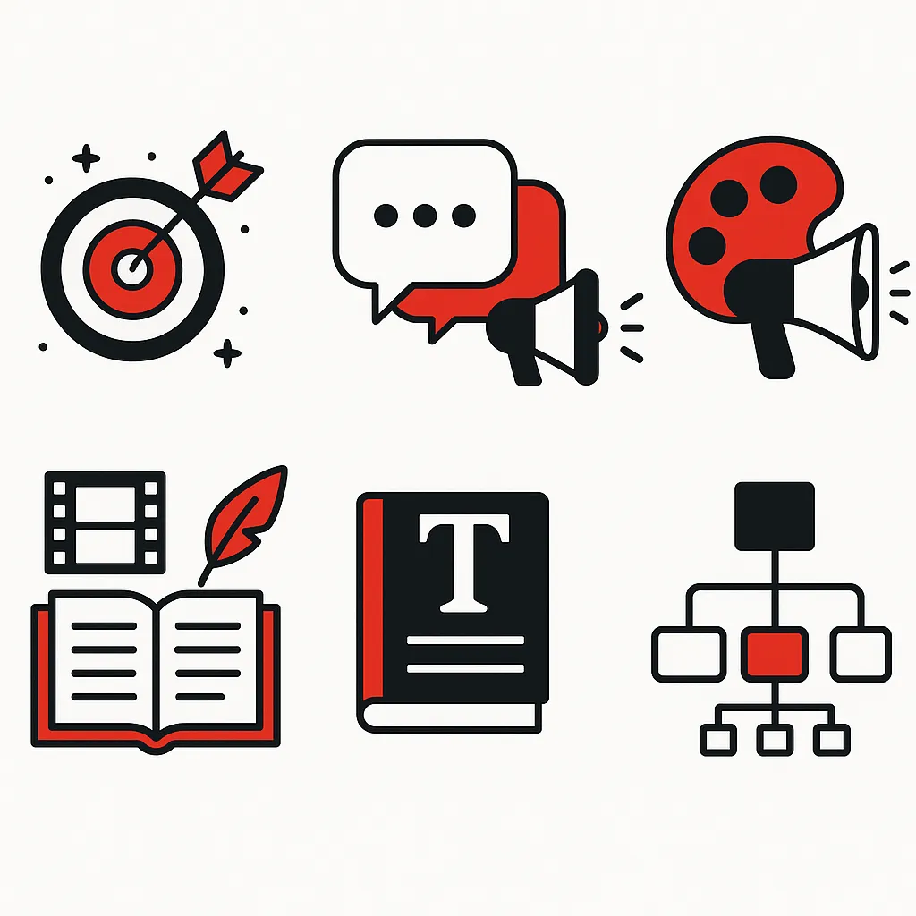 Narrative pillars, message hierarchy by funnel stage, taglines/slogans, tone of voice, and do/don’t language.