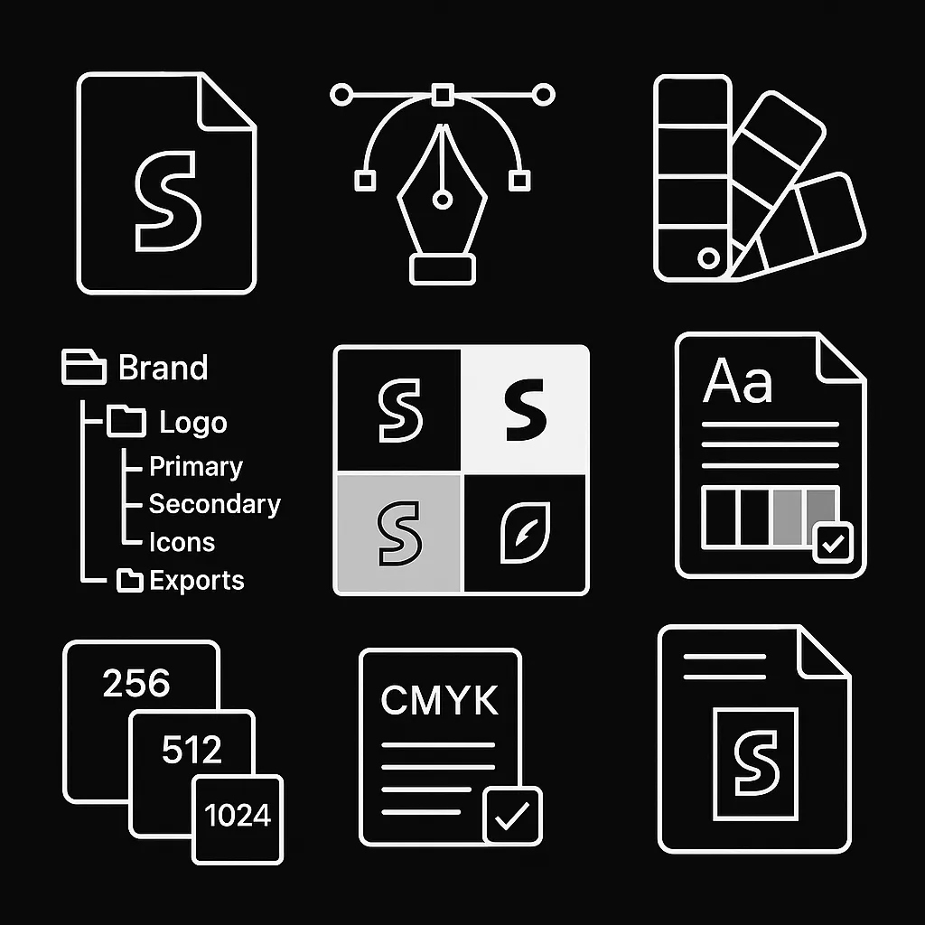 Clean folder/naming structure (Brand/Logo/Primary, Secondary, Icons, Exports) for easy handoff and team use.