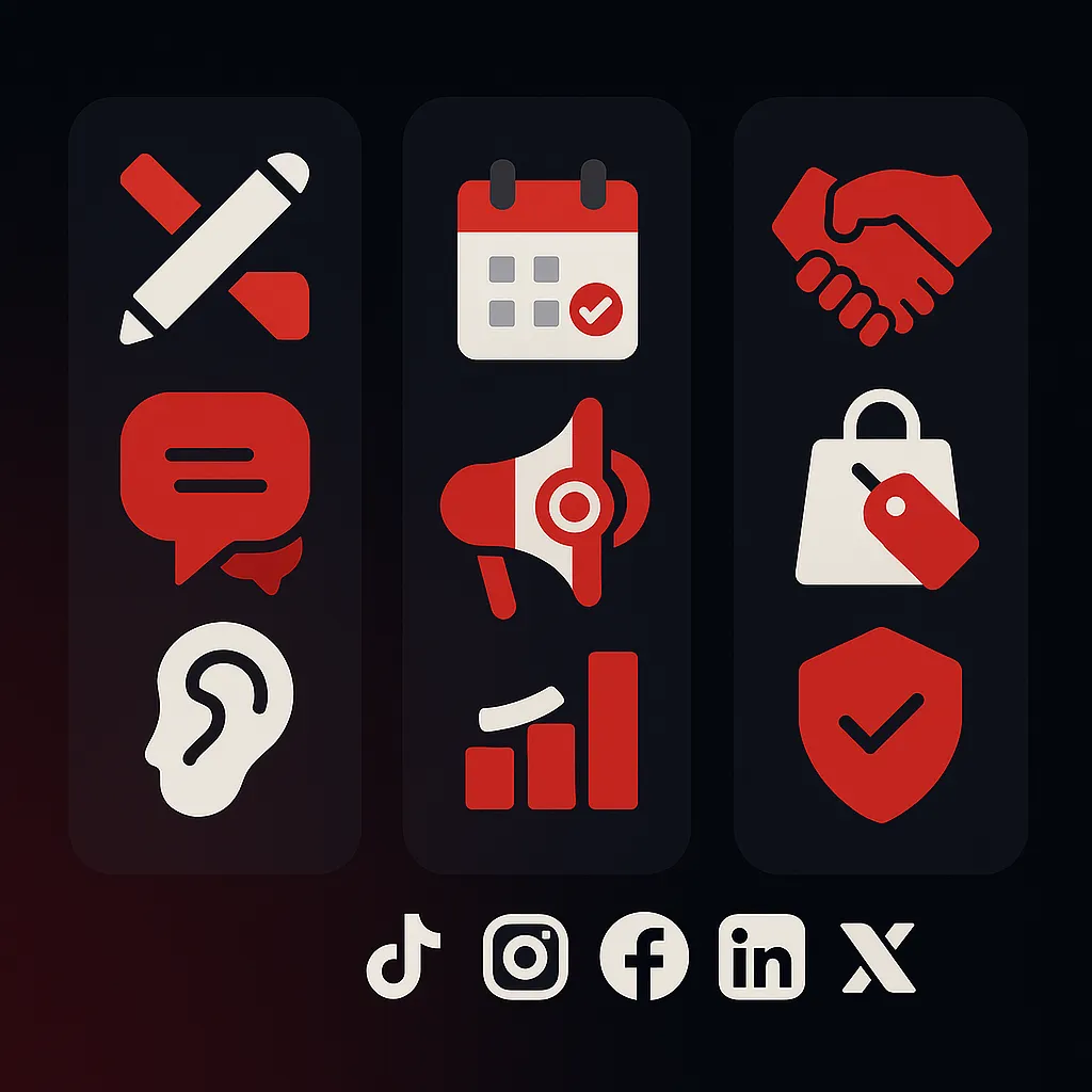 We handle the full loop: strategy, production, scheduling, community engagement, paid amplification, and analytics. That means daily management when things are steady, performance sprints when you want to scale, and specialized plays when the internet gets weird—crisis comms, influencer/UGC collaborations, social SEO, and storefront integrations. We test, learn, and iterate with clean dashboards and concrete next steps, turning social from a roulette wheel into a repeatable growth machine that earns attention, builds trust, and moves pipeline.